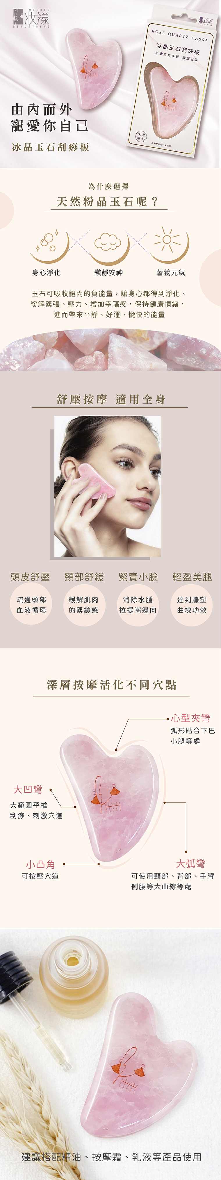 可溫潤臉部經絡,達到按摩及拉提效果,且能幫助保養品吸收